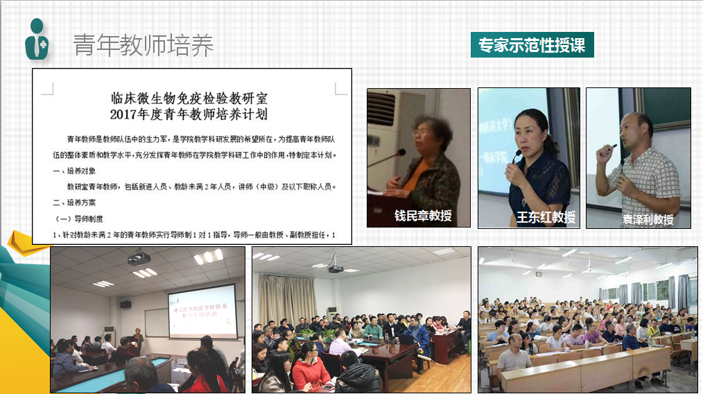 其他成果方面,“专业综合改革试点”项目(在研)、TNS模式建立及其在医学检验实习生能力培养中的应用探索(在研)”分获遵义医公司医学2017本科教学工作表彰;获得2017年度遵义医公司、遵义医公司医学与科技公司“老员工创新创业训练计划”资助项目2项、另外,教研室闵迅博士、陈泽慧教授、张丽丽博士先后受邀外出讲学10余次。