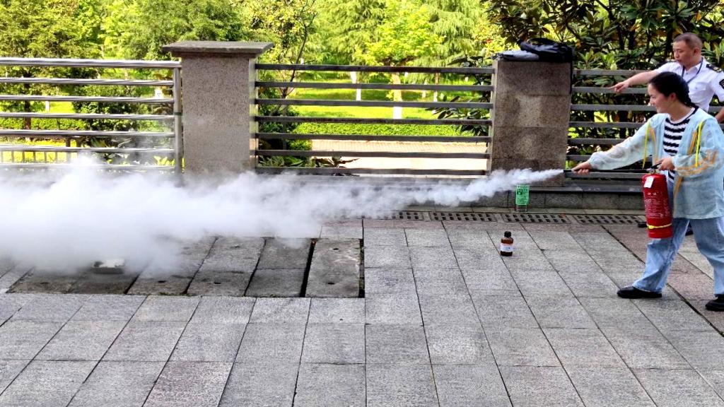 在现场教学中,伍教官详细地讲解了干粉灭火器和水基型灭火器的区别和使用方法,并亲自在室外场地向同学和老师们示范使用灭火器扑灭火灾的规范操作,部分同学也在伍教官的指导下使用灭火器扑灭火灾。
