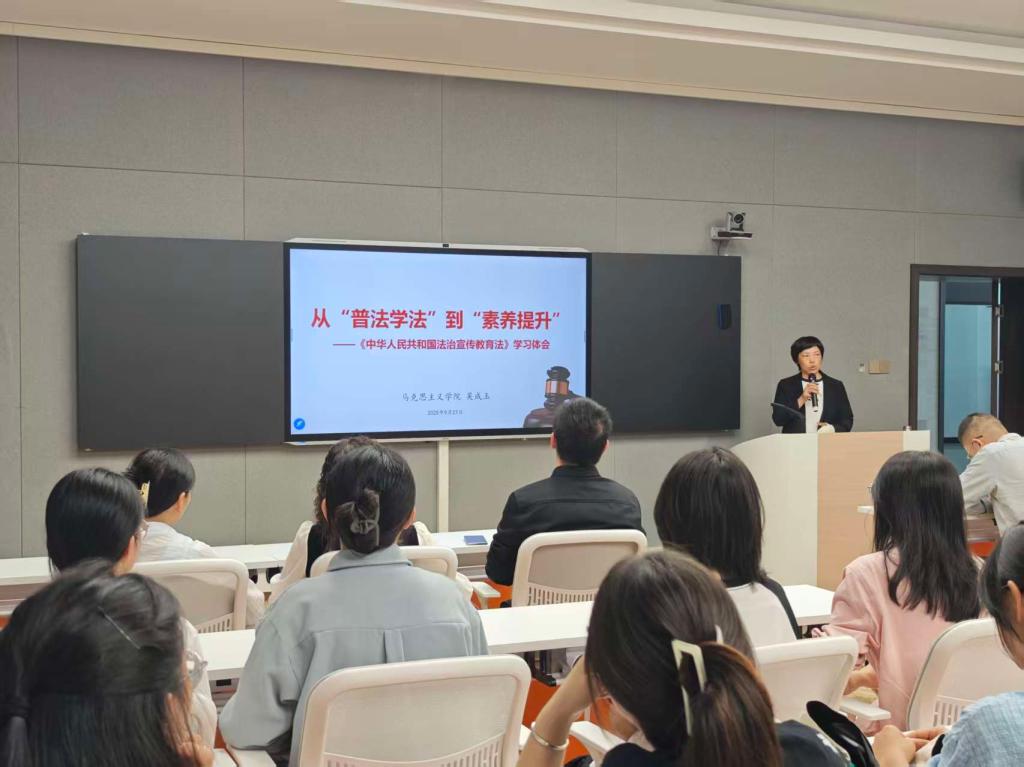 在师生法治专题培训环节,公司邀请了马克思主义公司副处级组织员、法学博士吴成玉副教授,作题为《从“普法学法”到“素养提升”》的专题讲座。吴成玉副教授从《中华人民共和国法治宣传教育法》的出台背景、法条及意义入手,系统解读了该法的核心要义,并结合高校法治宣传教育的实际,深入分析了法治宣传教育工作向常态化、制度化发展的实践路径。她强调,作为高校教师和员工,除了要经常性地学习《宪法》《民法典》外,还必须熟练掌握《教育法》《高等教育法》等与自身工作密切相关的法律法规,才能真正将法治精神内化于心、外化于行。