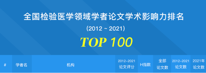 据悉:本排名是基于"全球学者库"的海量论文数据,广泛采集了最近十年检验医学领域中国学者在海外发表的相关论文,建立基于论文的学者学术影响力评价方法、指标体系和数学模型,然后计算每位学者每篇论文的得分,将其全部论文累加获得每位学者的总积分,按总积分由高到低排序得到百强排名。