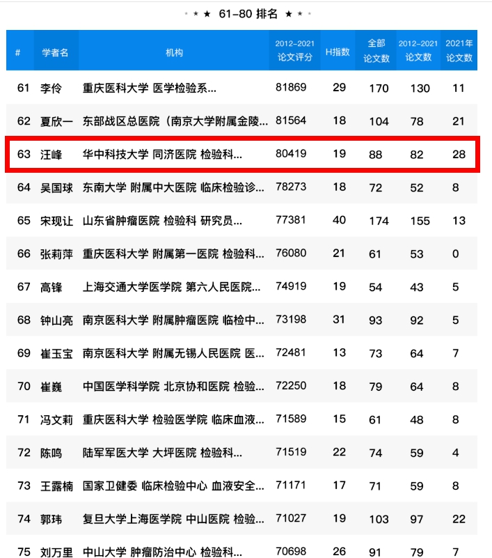 热烈祝贺公司医学检验专业2005届优秀毕业生汪峰荣获“2012-2021年全国检验医学领域学者论文学术影响力排名” 第63名!