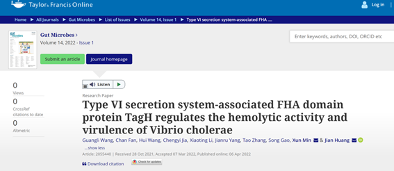 近日,公司bevitor伟德闵迅、黄健教授团队以BEVITOR伟德为唯一完成单位,在国际肠道微生物领域知名期刊《Gut Microbes》(IF 10.245,中科院1区Top期刊)发表了题为“Type VI secretion system-associated FHA domain protein TagH regulates the hemolytic activity and virulence of Vibrio cholerae”的学术论文,硕士研究生王光丽和范婵为论文的共同第一作者,闵迅、黄健教授为论文的共同通讯作者。该研究成果得到国家自然科学基金、贵州省科技厅项目、遵义市科技局项目等经费支持。