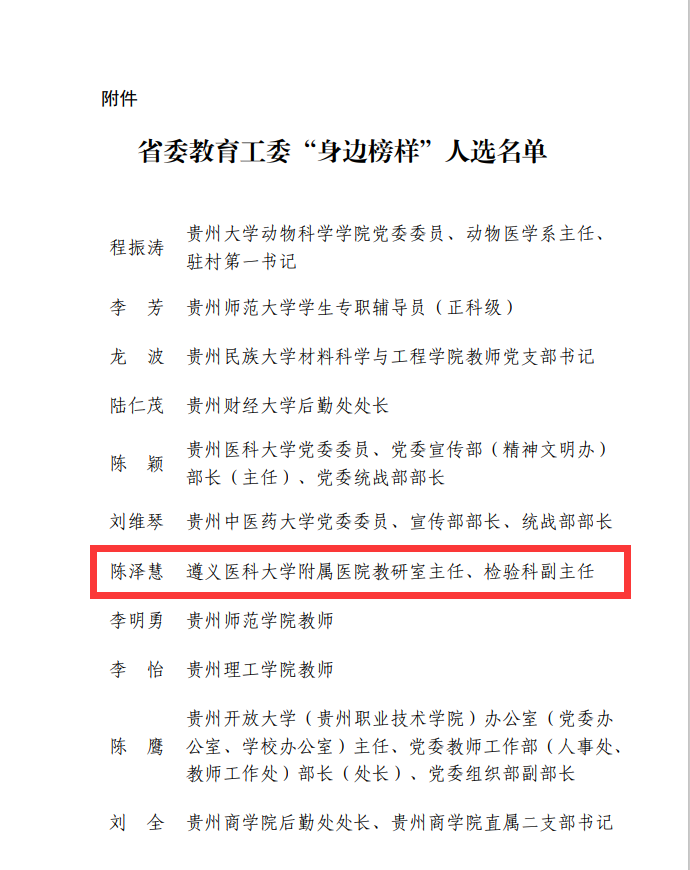 近日,省委教育工委公布了“身边的榜样”评选结果,公司附属医院陈泽慧同志荣获此荣誉称号。