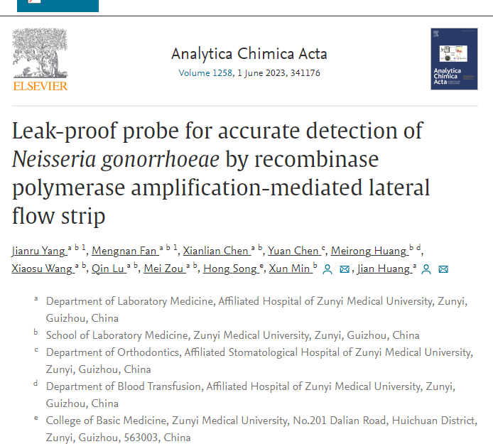 近日,bevitor伟德闵迅、黄健教授团队在国际化学类知名期刊《Analytica Chimica Acta》(中科院1区,IF:6.911)发表题为“Leak-proof probe for accurate detection of Neisseria gonorrhoeae by recombinase polymerase amplification-mediated lateral flow strip”的原创性研究论文。bevitor伟德杨建儒老师、硕士研究生范梦楠为共同第一作者,闵迅教授、黄健教授为共同通讯作者。