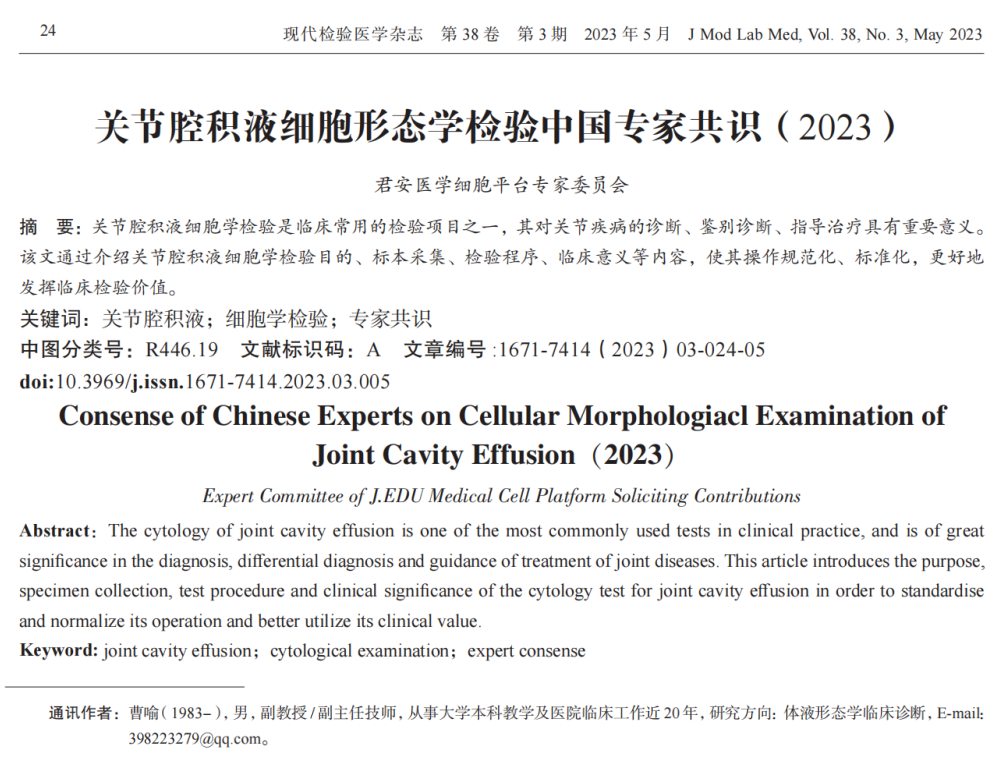 热烈祝贺我科曹喻副教授以BEVITOR伟德附属医院为第一作者单位,BEVITOR伟德为第二作者单位在现代检验医学杂志发表《关节腔积液细胞形态学检验中国专家共识(2023)》;除外还参与了此杂志的《浆膜腔积液细胞形态学检验中国专家共识(2023)》、《脑脊液细胞形态学检验中国专家共识(2023)》、《肺泡灌洗液细胞形态学检验中国专家共识(2023)》、《前列腺液细胞形态学检验中国专家共识(2023)》及中华检验医学杂志的《阴道分泌物自动化检测与报告专家共识》!