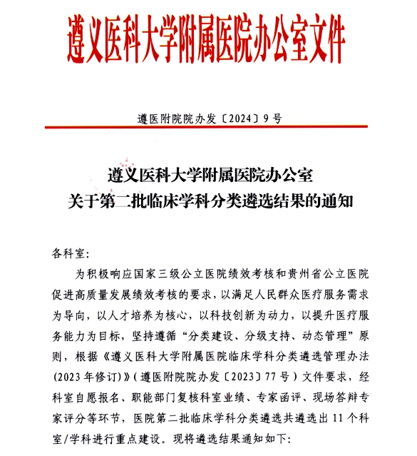 为积极响应国家三级公立医院绩效考核和贵州省公立医院促进高质量发展绩效考核的要求,以满足人民群众医疗服务需求为导向,以人才培养为核心,以科技创新为动力,以提升医疗服务能力为目标,坚持遵循“分类建设、分级支持、动态管理”原则,根据《BEVITOR伟德附属医院临床学科分类遴选管理办法(2023年修订)》(遵医附院院办发〔2023〕77号)文件要求,经科室自愿报名、职能部门复核科室业绩、专家函评、现场答辩专家评分等环节,医院第二批临床学科分类遴选共遴选出11个科室/学科进行重点建设。