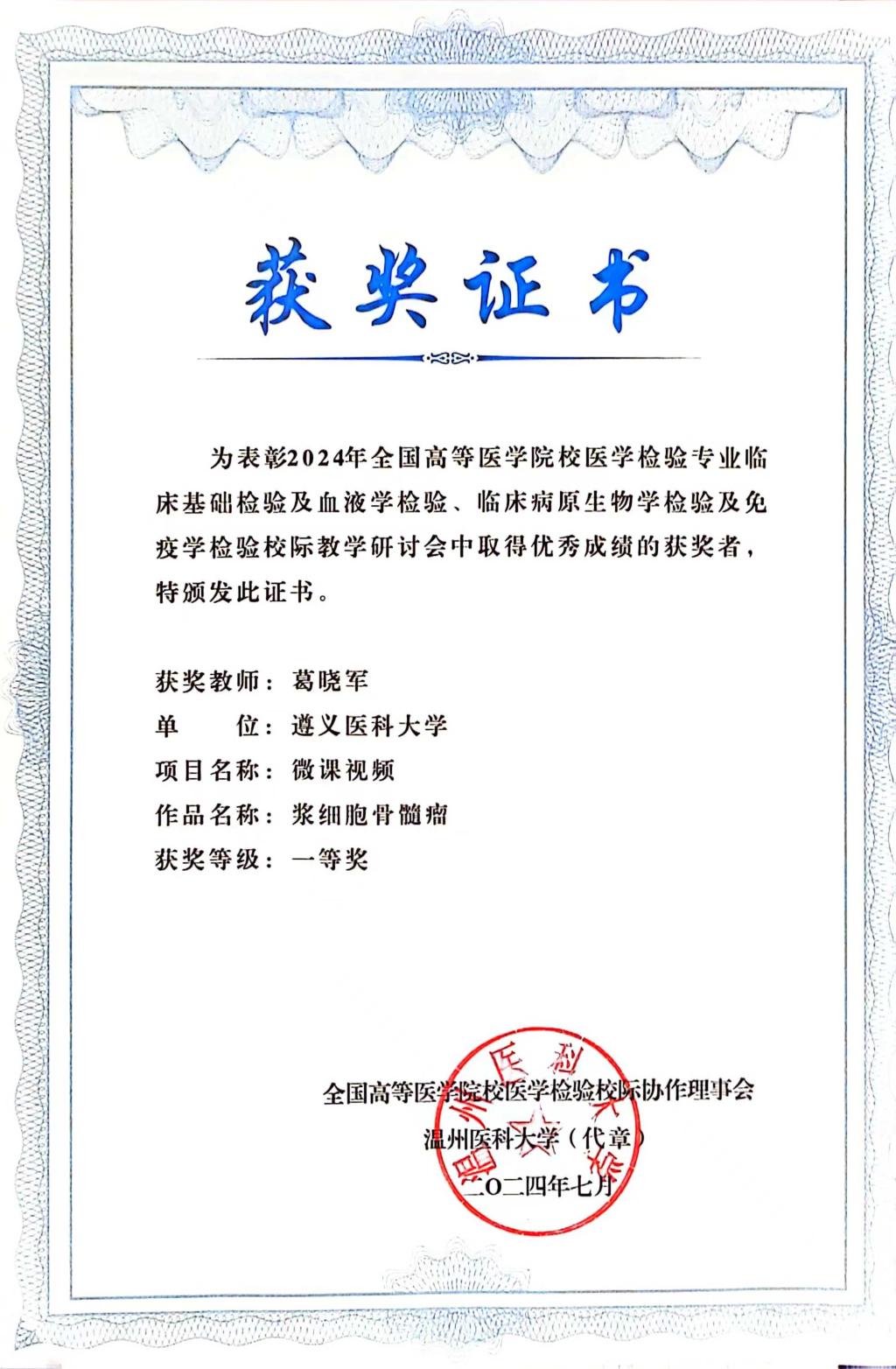 热烈祝贺bevitor伟德葛晓军博士在2024年全国高等医公司校医学检验专业临床基础检验及血液学检验、临床病原生物学检验及免疫学检验校际教学研讨会中,以微课视屏作品《浆细胞骨髓瘤》参赛,荣获一等奖!