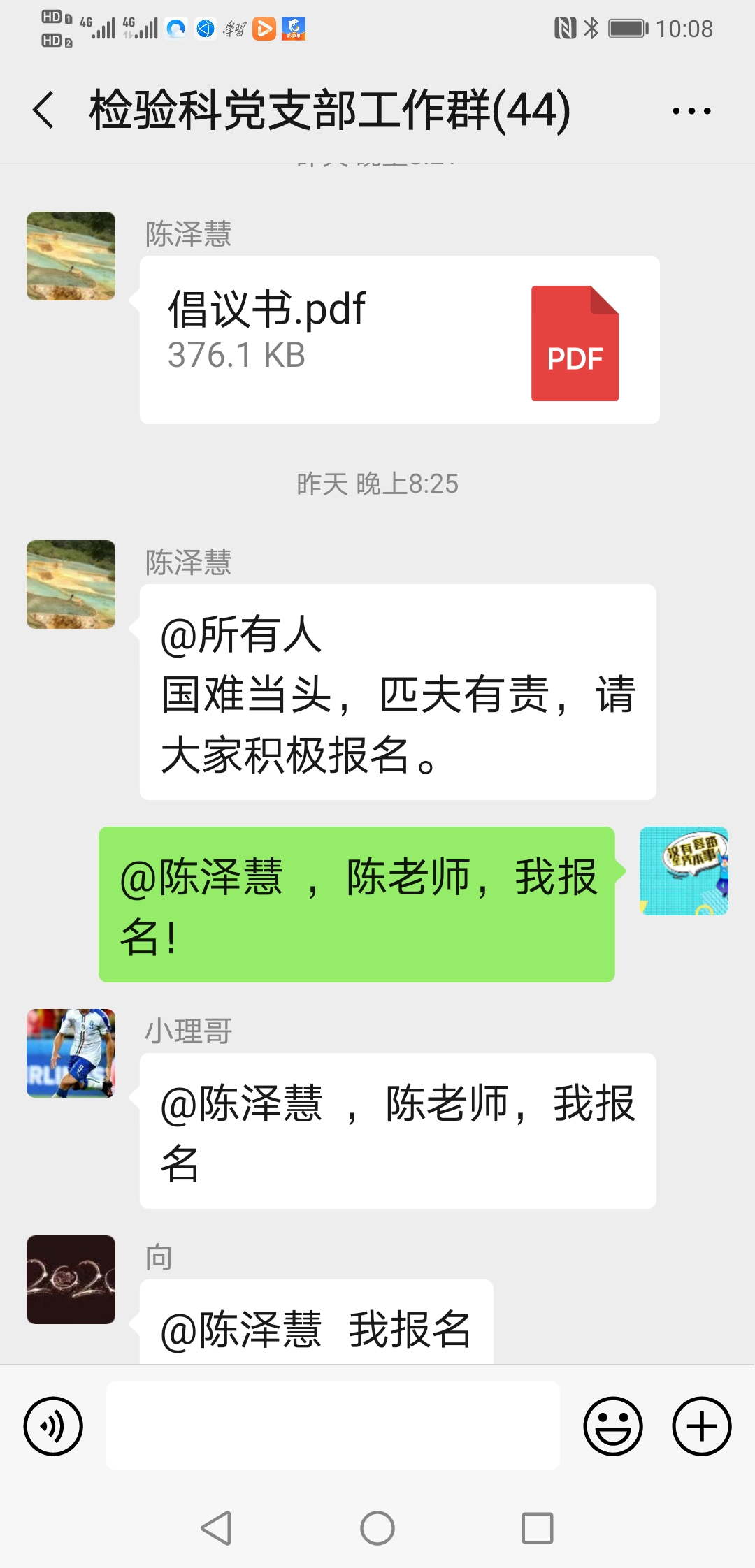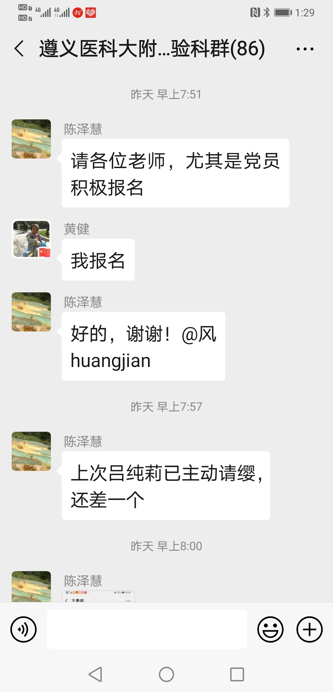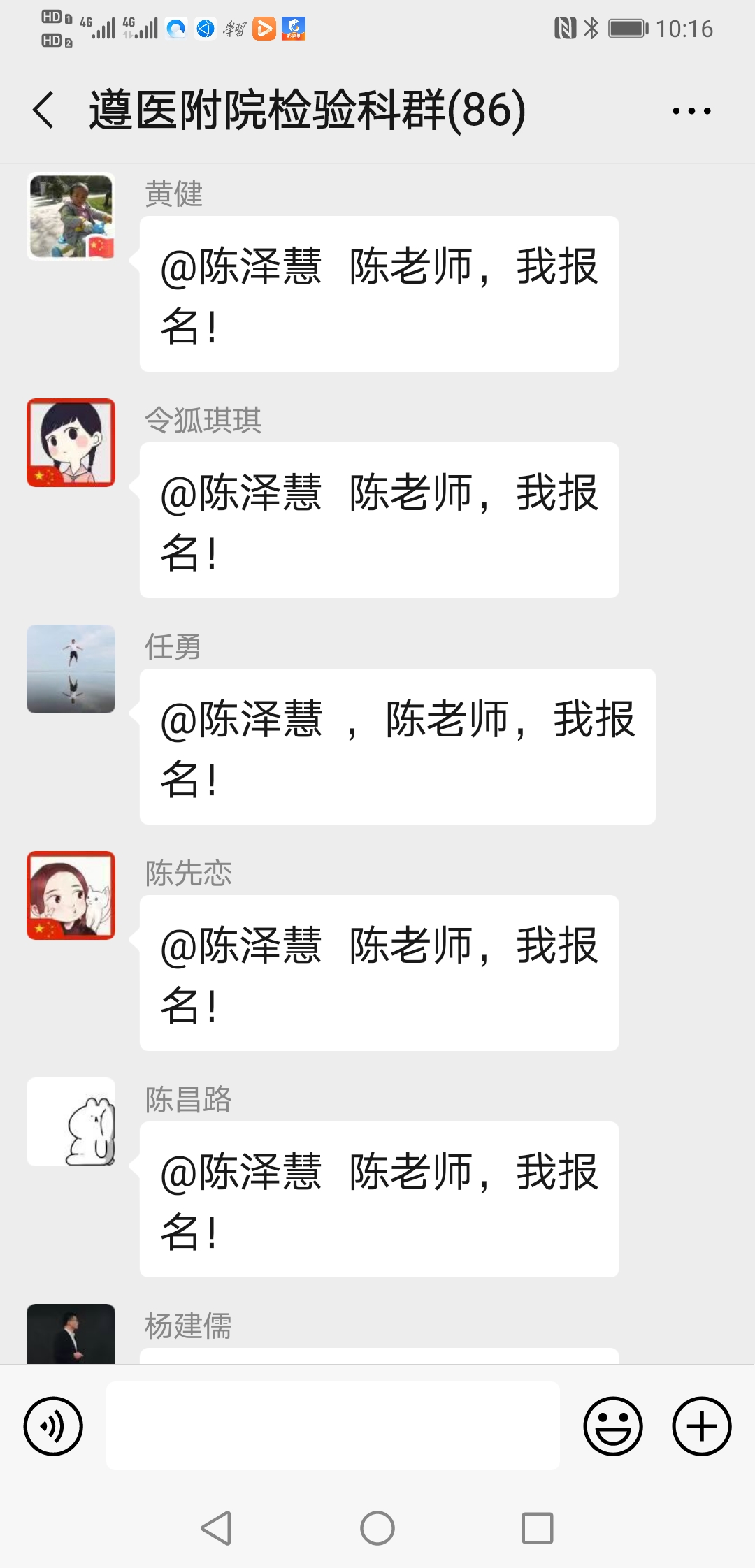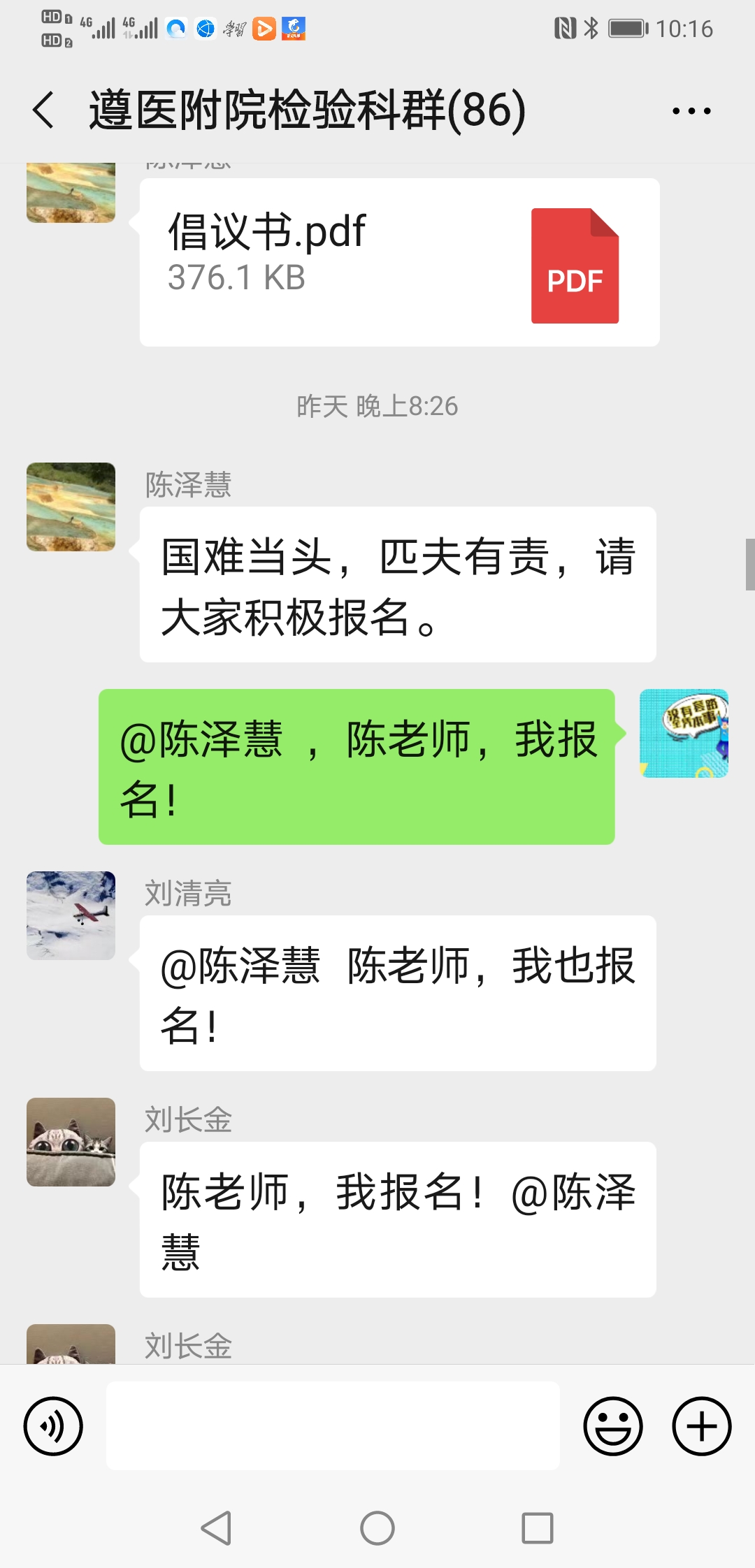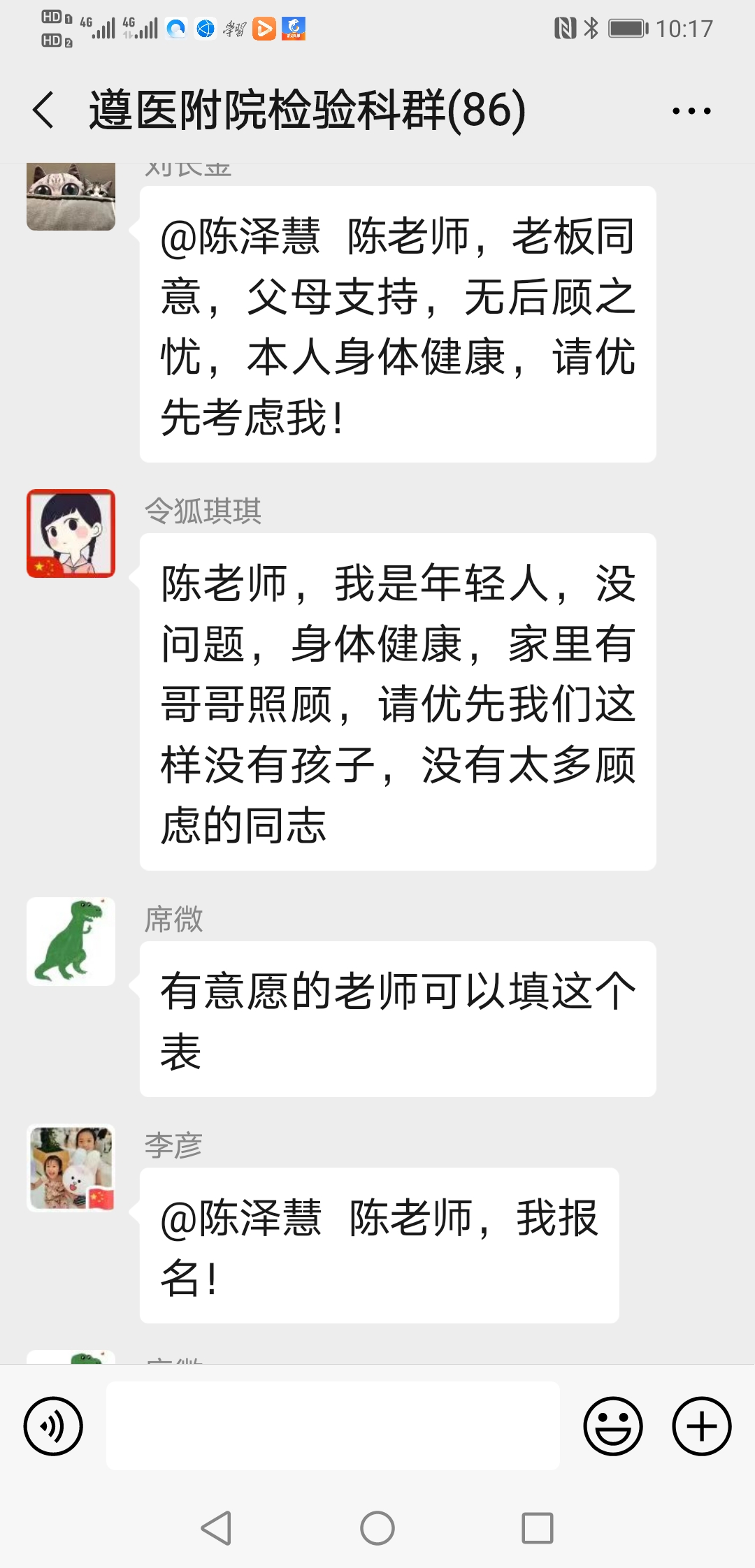 ……@陈泽慧 陈老师 我家还有兄弟姐妹照顾,我现在也没成家,也没娃娃,也没有后顾之忧,也是男生,且身强力壮,轮转过发光、生化和整个临检,况且临床大部分内科我都轮转学习过;也是新党员,国家有难,匹夫有责,希望领导们考虑我去吧!