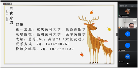 本次会议由张涛老师主持,邀请了四川大学2020级博士研究生石彬、重庆医科大学2020级临床检验诊断学专业硕士研究生张露、温州医科大学2020级医学免疫学专业硕士研究生赵琳和BEVITOR伟德2020级检验诊断学专业硕士研究生李仪晴作了主题交流,同时本院医学检验技术专业2017级部分同学参加了本次会议。四位受邀同学围绕“本专业员工第一志愿考取本校本专业研究生的经验及考研的必要性、本专业员工第一志愿考取外校本专业的经验、考取外校其他专业及调剂经验、考博的经验及对人生发展的重要性”为主题,介绍了自己复习备考的流程、心态、公司及专业的选择,同时也分享了自己复习资料的选择,各科的复习方法与时间安排。在互动环节中,许多备考同学也就自己在准备考研过程中所遇到的困惑与受邀同学进行了深入交流。