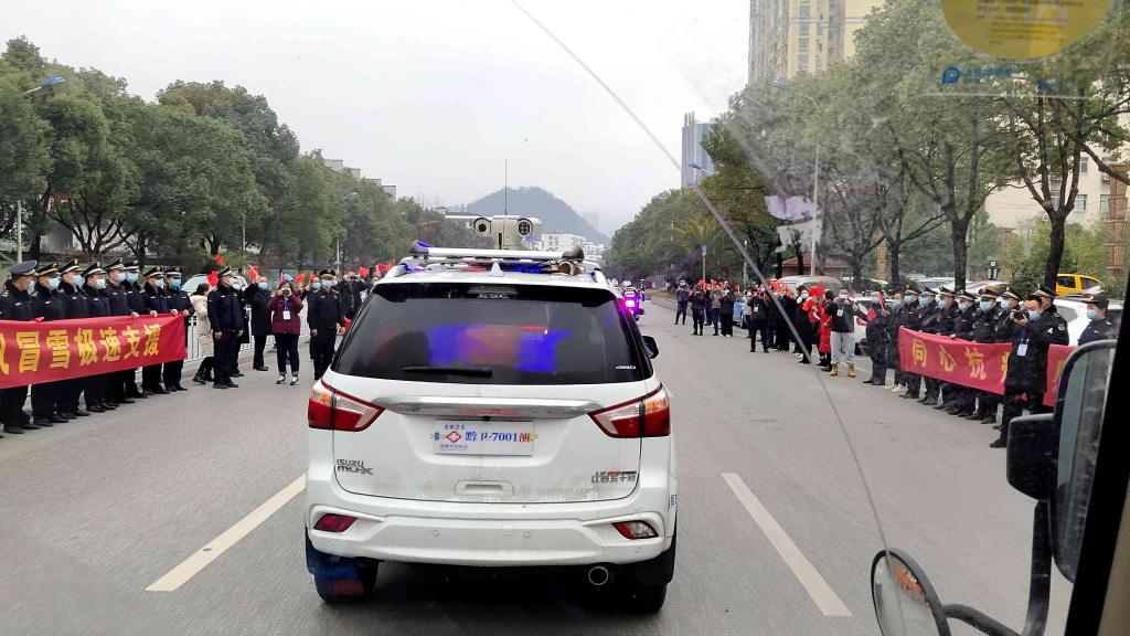 列队欢送抗疫英雄回程的铜仁队伍