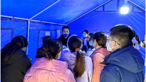 12月28日,接贵州省卫健委援铜正式通知后,由魏在荣副经理带队,组织遵医附院及遵义市67人的检验队伍出发前往铜仁市支援开展核酸检测工作,这得益于前期医院及遵义市卫健委的前期沟通和准备。凌晨1:00,队伍未作休息即由魏在荣副经理和闵迅主任在搭建的临时帐篷内组织召开了首次援铜工作部署会议,其中:由魏在荣副经理担任总指挥,任命闵迅、吴凯峰、陈泽慧共同担任本次援铜抗疫组长,向加林、沈欣共同担任副组长;任命肖代敏、查何共同担任质量和技术主管;任命黎兵担任后勤保障组组长、杨小理、任勇担任前处理组组长、王勰、梁钟智担任生物安全组组长;任命董泽令、郑国波、田地分别担任3辆火眼移动式检测车车长。在明确各自岗位和工作职责后,整支队伍迅疾开始场地规划、物资搬运、帐篷搭建、电源水源信息系统接入、仪器设备启用等工作。直至凌晨4点所有准备工作基本到位,能够满足29日全员城市核酸检测工作相关条件。