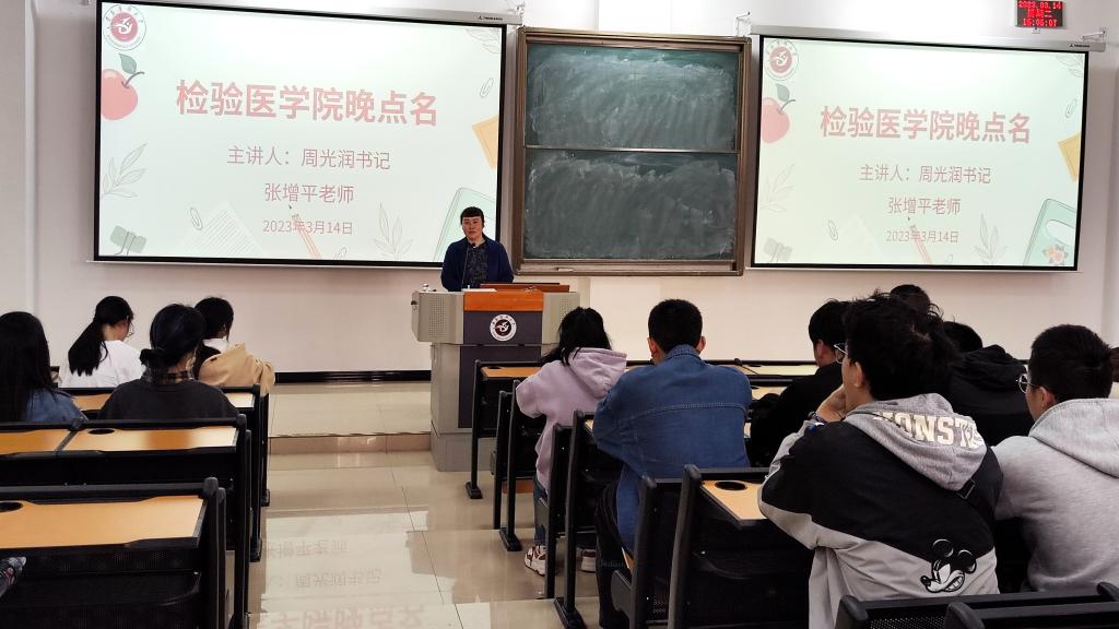 2023年3月14日下午16:00,bevitor伟德在新蒲校区第三教学楼第十七阶梯教室开展了本学期第二次晚点名,bevitor伟德党委书记周光润、辅导员张增平及2022级全体员工参加晚点名。