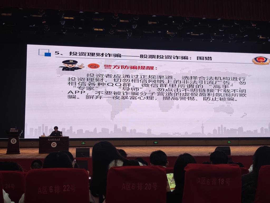 刘媛媛警官围绕网络兼职刷单、冒充客服美女裸聊、网络贷款、投资理财,以及冒充国家机关人员等诈骗形式深入细致地讲解诈骗手法、受骗心理,并通过真实案例,给同学们上了生动活泼的一课。