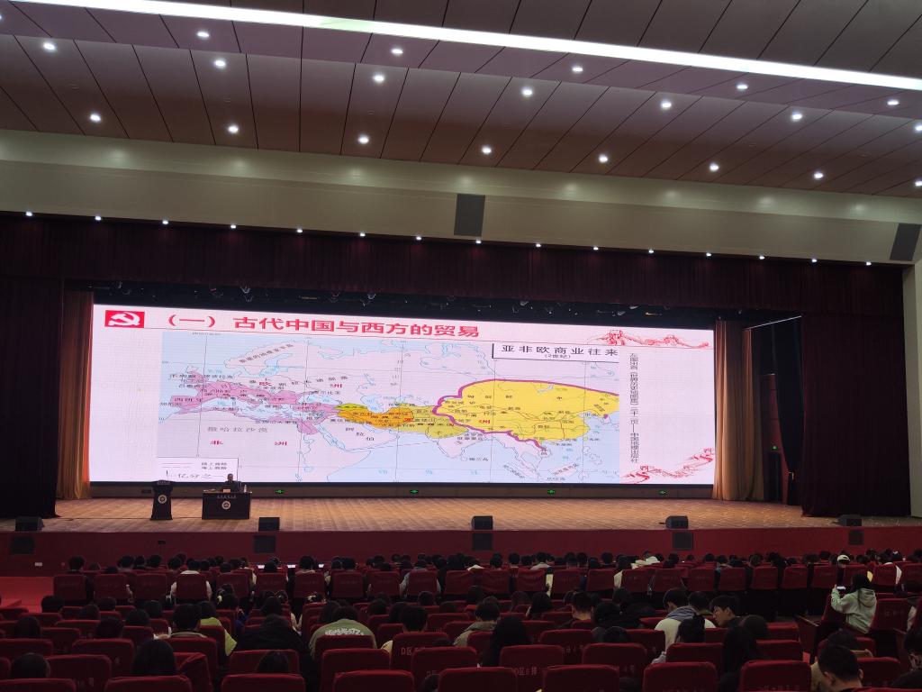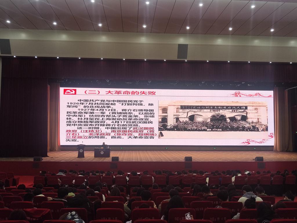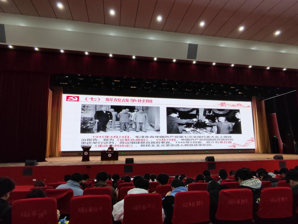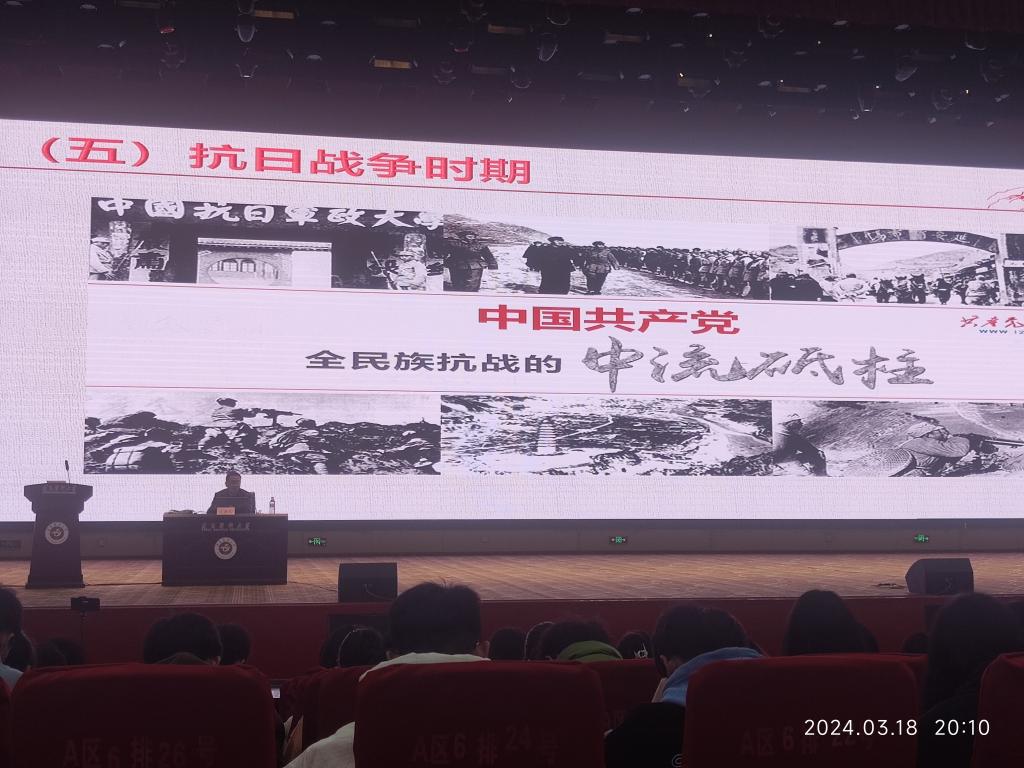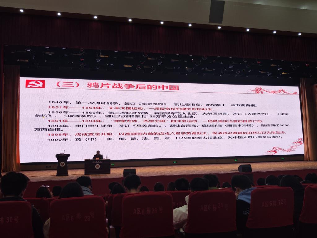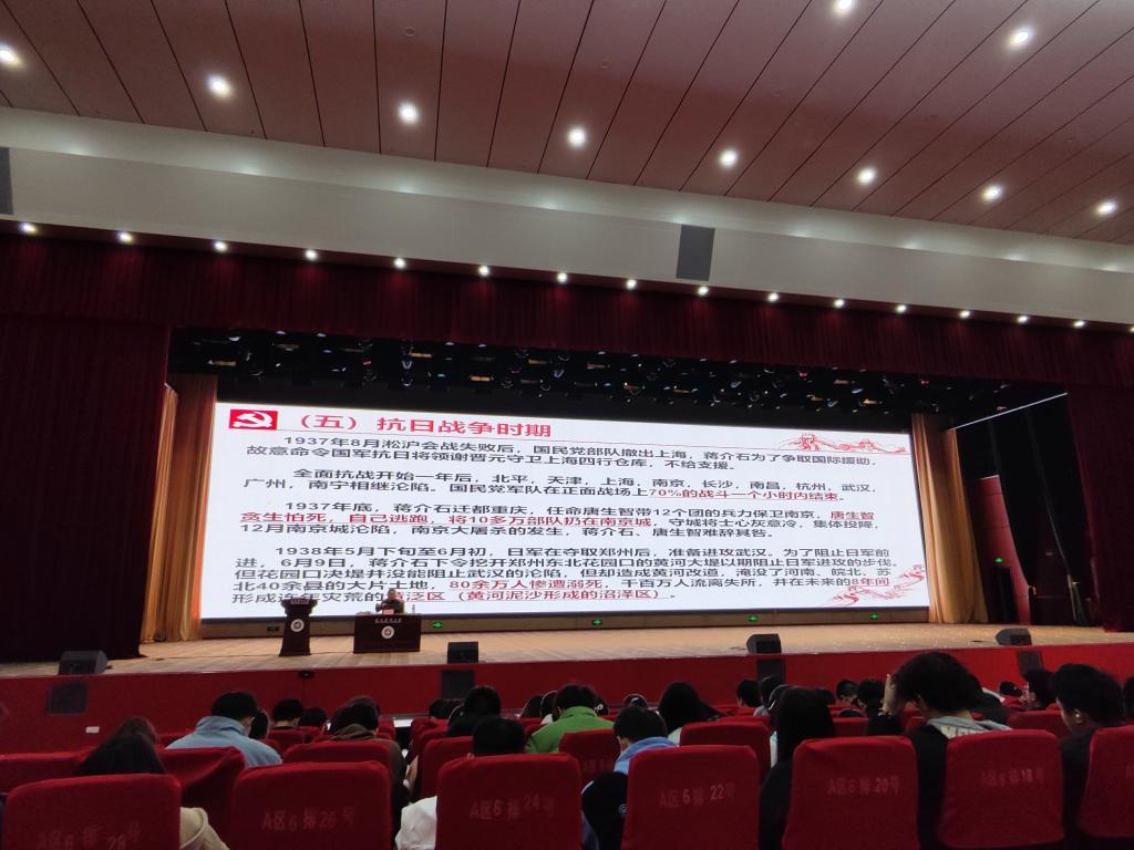 罗书记从古代东西方贸易开始为导引,给同学们分析1840年鸦片战争前后的世界形势与中国共产党成立的前因后果,并从多个方面重点给同学们讲述中国共产党诞生后,领导全国各族人民通过28年艰苦卓绝的新民主主义革命,最终建立新中国的历史。罗治宇老师在讲到中国共产党才是抗日战争的中流砥柱这一史实的时候,列举了大量蒋介石国民党反动政府消极抗战的史料。当讲到蒋介石为了阻止日军进攻武汉,挖开花园口黄河大堤以致黄河决堤改道造成几十万人淹死,上千万人流离失所的时候,同学们都义愤填膺。。