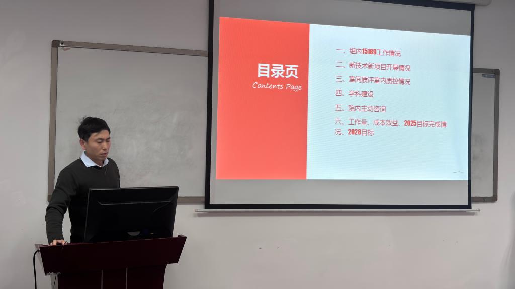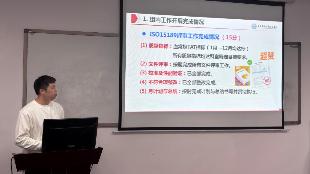 接着,8名专业组组长分别就ISO15189分管工作、新技术新项目开展、室间质评与室内质控、工作量与成本效益、培训交流、科研论文与教学情况以及新年计划等内容作了汇报。5名综合组组长及工会主席则围绕本职工作完成情况、存在问题及2026年计划进行了述职。