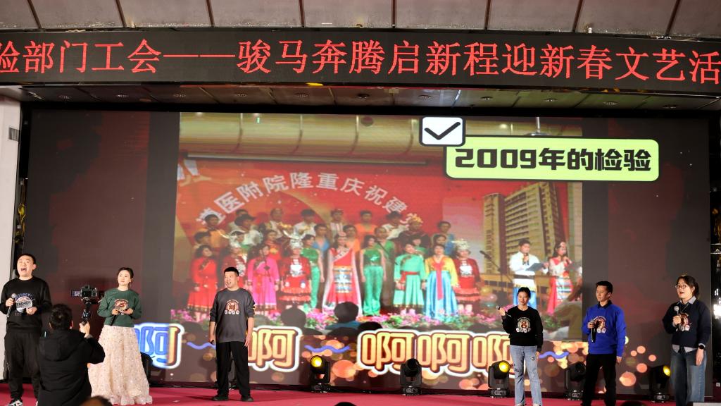 汇演在动感十足的开场舞中拉开序幕。小品《医路有你——假如医院没有检验科》以幽默风趣的表演,诠释了检验人精益求精、精准履职的职业精神,凸显了检验科在医院运转中的重要性与不可替代性。歌曲《一路生花》以婉转动听的旋律,传递出对新年的美好祝福与对未来的殷切期许。乐器演奏《梁祝》展现了中国传统音乐的独特魅力与深厚文化内涵。改编歌曲《像我们这样的团队》《当》生动描绘了检验人在实验室的工作日常,“团结”是检验科的工作底色,检验人携手攻坚、默契配合的协作精神则是科室发展的基石。朗诵《血脉长河——我们的生命接力》讲述了输血科工作的真实写照,表达了检验人对生命的敬畏之心与对献血者的感恩之情。舞蹈《异域风情》以灵动的姿态展现了青春的蓬勃活力。