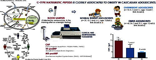 C-type natriuretic peptide (CNP) is a natural regulator of adipogenesis playing a role in the development of obesity in childhood. To evaluate CNP plasma levels in normal-weight (N), overweight (OW) and obese adolescents (O). Eighty two subjects (age:12.8 ± 2.4, years) without cardiac dysfunction were enrolled and CNP plasma levels were measured by RIA. NT-proBNP, MR-proANP, AGEs, reactive hyperemia index (RHI) and standard clinical chemistry parameters were also measured. O and OW adolescents had higher values of BMI and fat mass than N. CNP levels were significantly lower in OW:4.79 [3.29–21.15] and O:3.81 [1.55–13.4] than in N:13.21 [7.6–37.8];P< 0.0001 N vs O,P= 0.0003 N vs OW). LogCNP values correlated significantly and inversely with BMI z-score, FM%, TF% and circulating levels of CRP, insulin, total cholesterol, LDL, and triglycerides, in addition to an inverse relationship with skin AGEs and a direct correlation with RHI. LogCNP was also inversely associated with LogNT-proBNP and LogMR-proANP values. Using ROC analysis the risk of obesity resulted significantly (P≪0.0001) associated with CNP values (AUC = 0.9724). The results suggest that CNP may play a more important role than BNP and ANP related peptides, as risk marker of obesity, in addition to its involvement in adipogenesis and endothelial dysfunction.
